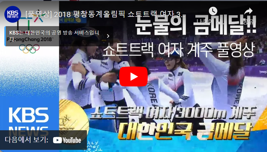 - 영상: 유튜브에서 '2018 평창 동계올림픽 쇼트트랙 여자 3000m 계주'를 검색하면 경기 영상을 시청할 수 있습니다.